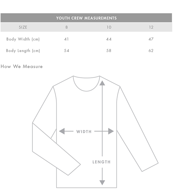 Construction: Crew sweat, raglan sleeves, neck and sleeve cuff ribbing, preshrunk to minimise shrinkage
